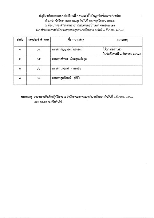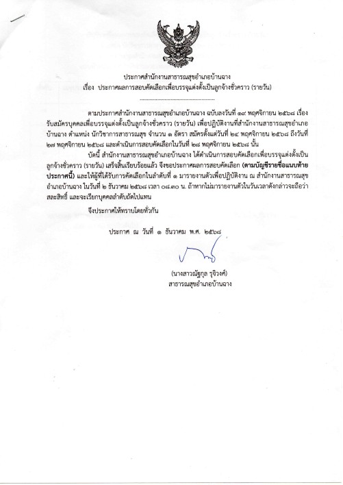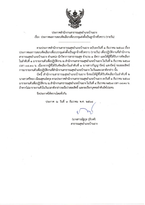 ประกาศ ผลสอบการคัดเลือกเพื่อบรรจุแต่งตั้งเป็นลูกจ้างชั่วคราวรายวัน ตำแหน่ง นักวิชาการสาธารณสุข ณ วันที่ 3 ธ.ค.2568
