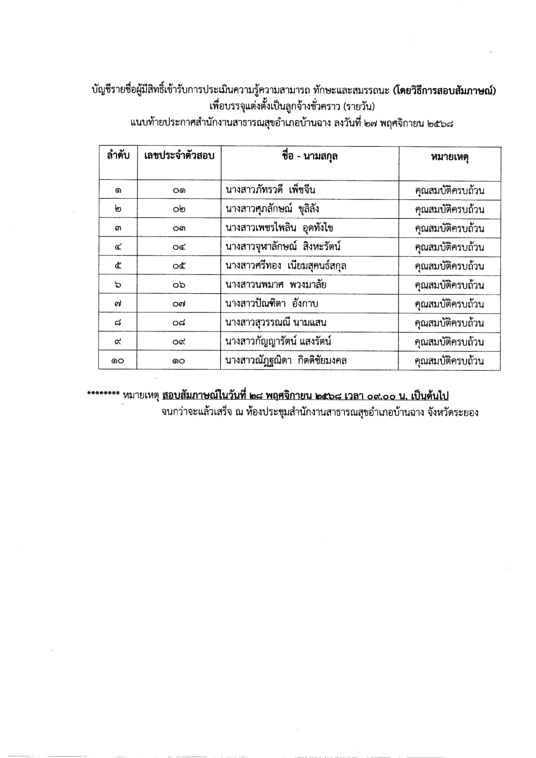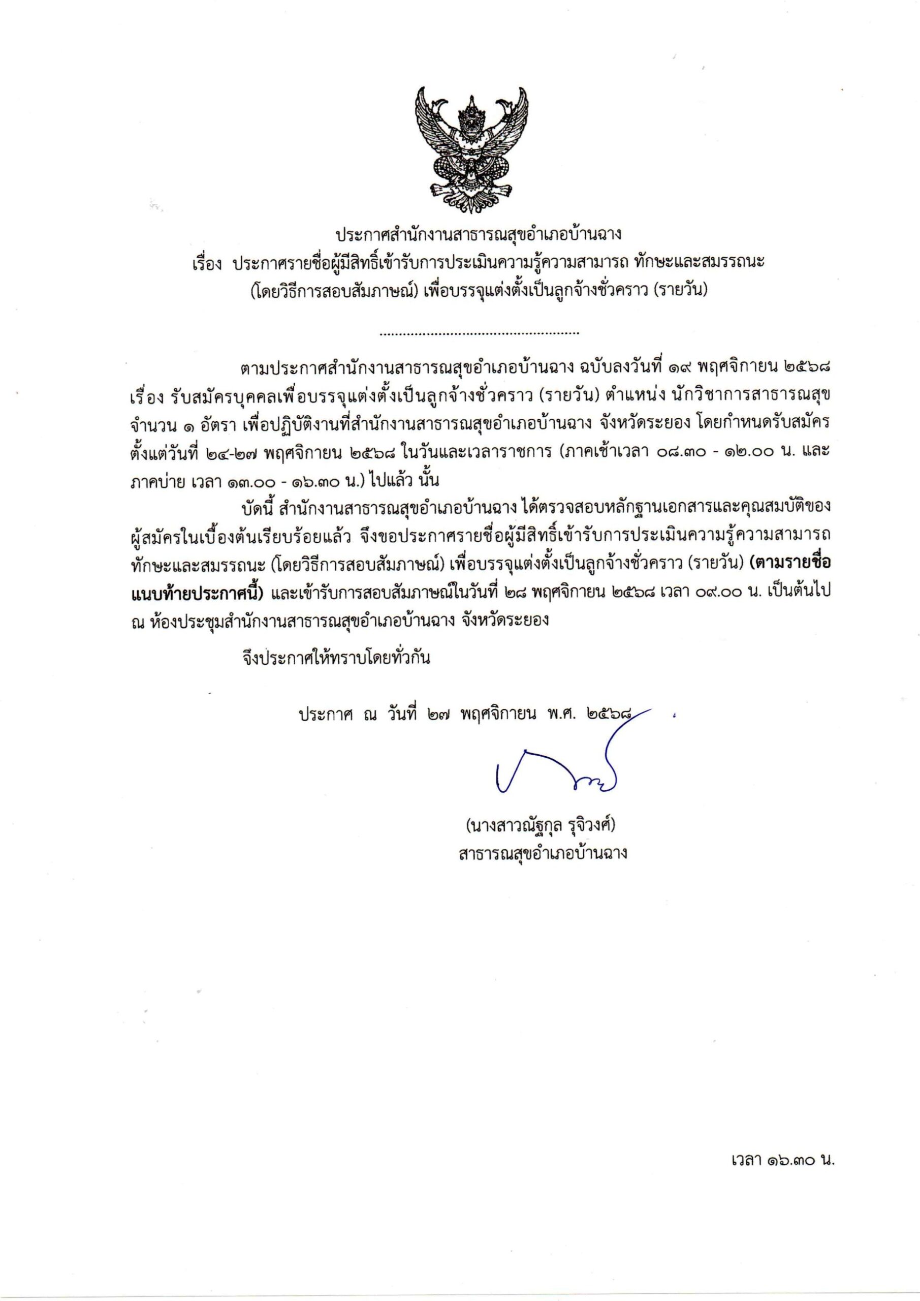 ประกาศ สำนักงานสาธารณสุขอำเภอบ้านฉาง เรื่อง ประกาศรายชื่อผู้มีสิทธิ์สอบสัมภาษณ์ เพื่อบรรจุแต่งตั้งเป็นลูกจ้างชั่วคราว 27 พ.ย.2568
